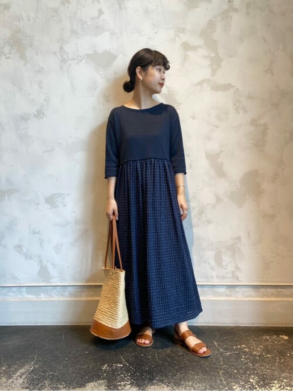 【onepiece 】着用サイズ:F ウエストあたりでギャザーの切り替えのデザイン。 上はニットで、下がシワ感のあるチェック柄の異素材を楽しめるワンピースです。 着丈は、足首が少し見えるくらいの長さなので、フラットシューズでも安心です。 袖丈も肘が隠れる長さなので、羽織なしで一枚で着れます。 伸縮性:ニット部分あり 透け感:あり(なので、ペチコートがセットです) 裏地 :ペチコートあり 光沢感:なし 色落ち:なし 【bag】 a. 【sandal】着用サイズ:37