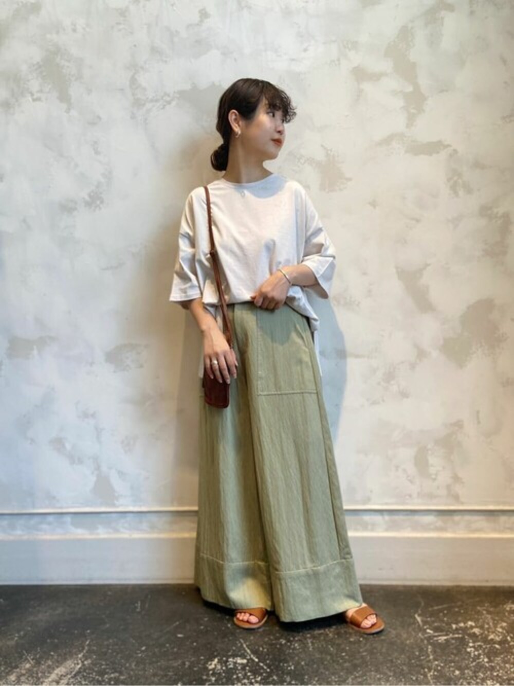 【tops】着用サイズ:F 昨年も人気のカットーが再登場! 身幅もたっぷりあり、肘まで隠れる袖丈で一枚でも着やすいカットソー。 着丈はお尻まで隠れるので、細身でもワイドでも合わせやすいです。 サイドにはスリットが入っているので、前だけインするとすっきりとした印象で着ていただけます。 洗濯 :手洗い可 伸縮性:あり 透け感:なし 裏地 :なし 光沢感:なし 色落ち:なし 【bottom】着用サイズ:F 大きなボックスポケットが可愛いデザイン。 幅広のワイドのデザインですが、軽い素材なので重たく見えないです。 着丈は私の身長で足首が隠れるフルレングスで穿けます。 フラットシューズでも安心です。 伸縮性:なし 透け感:なし 裏地 :なし 光沢感:なし 色落ち:なし 【bag】 Harbour2nd 【sandal】着用サイズ:37 FABIO RUSCONI