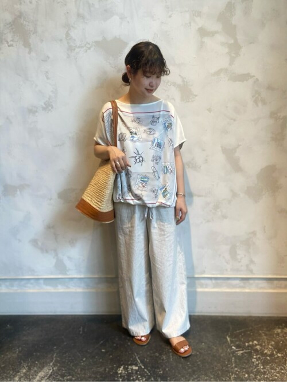 【tops】着用サイズ:F コルシカスカーフニット ¥24,200 → ¥16,940(税込) (30%OFF) コルシカをイメージしたプリントを施したデザイン。 夏らしい爽快な気分で着ていただけます。 155cmの私が着て、腰の位置くらいの着丈です。 裾は紐が通っており、絞って調節をしてシルエットを変えていただけます。 洗濯:手洗い可 伸縮性:後ろ身頃のみあり 透け感:多少あり 裏地 :なし 光沢感:なし 色落ち:なし 【skirt】着用サイズ:1 定番のウエストリブシリーズから新バージョン登場。 表面に凹凸感のあるデザインで、シワが目立ちにくくアイロンいらずで穿いていただけます。 0.1.2の3サイズ展開で、155cmの私で1サイズで丁度いいです。 洗濯:手洗い可 伸縮性:ウエスト部分あり 透け感:なし 裏地 :なし 光沢感:なし 色落ち:なし 【bag】 肩掛けのできるたっぷりと長さのある持ち手。 ラフィアの素材で夏場に大活躍します。 レザー部分は明るいブラウンなので、カジュアルにも綺麗めにも使えます。 【sandal】着用サイズ:37 サンダルの底が少しクッション仕様になっているので、疲れにくく歩きやすいです。 私は少し足幅があるので普段23.5cmで37サイズを選びました。