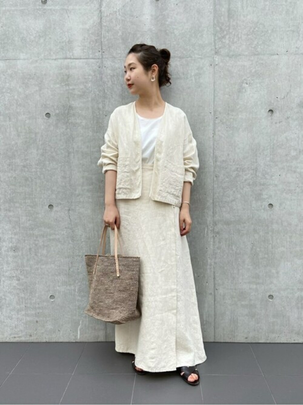【スタッフレビュー】 リネンのセットアップでお出かけスタイル。 柔らかなアイボリーの色味とリネンの風合いが涼しげな印象にしてくれます。 アンティーク風リネンハオリ ¥22,000 → ¥17,600(税込) (20%OFF) アンティーク風リネンスカート ¥22,000 → ¥11,000(税込) (50%OFF)