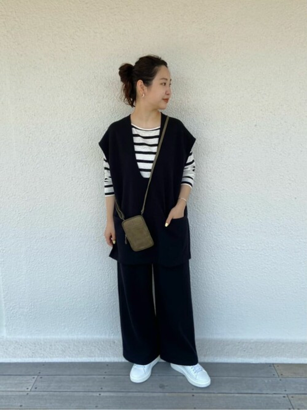 【tops】着用サイズ:F リネンボーダーカットソー ¥17,600 → ¥12,320(税込) (30%OFF) 155cmの身長で着丈はお尻まで隠れる長さです。 麻100%ですがチクッとせず着心地が良く、涼しく着れます。 羽織ものやベストなどの中にインナーとしても活躍します。 洗濯:手洗い可 伸縮性:あり 透け感:多少あり 裏地 :なし 光沢感:なし 色落ち:なし 【vest】着用サイズ:F コットンブークレ素材のベスト。 厚地過ぎないので夏から秋にかけての季節の変わり目や、冬場も使えそうです。 ボーダーのカットソーなど柄物と合わせてもおしゃれです。 着丈は、お尻まですっぽり隠れる長さで、サイドにはスリットも入っています。 伸縮性:あり 透け感:なし 裏地 :なし 【bottom】着用サイズ:1 ベストと同じくコットンブークレ素材のパンツ。 ワイドパンツですが、ストレートに近いシルエットです。 0.1.2の3サイズ展開で1サイズで足首にかかるちょうどいい着丈です。 伸縮性:あり 透け感:なし 裏地 :なし 【bag】Harbour2nd 【shoes】SAMPLE