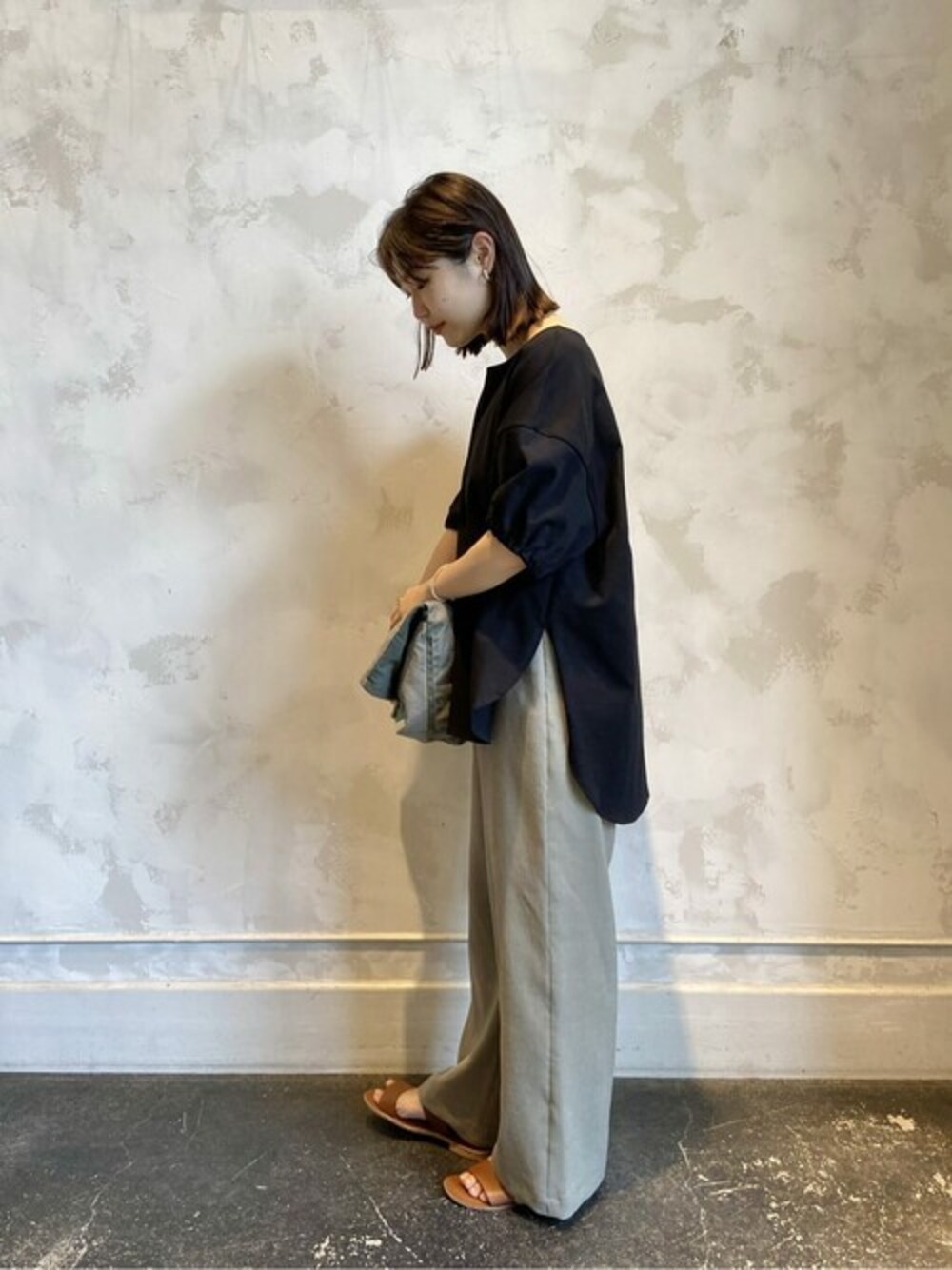 【tops】着用サイズ:F シンプルなカットソーのデザインですが、パフスリーブが女性らしさ感じるアイテム。 袖のボリューム感は紐で調節可能です。 着丈は、腰周りが隠れる長さで、サイドにスリットも入っているのでワイドボトムとも合わせやすいです。 洗濯 :手洗い可 伸縮性:あり 透け感:なし 裏地 :なし 光沢感:なし 色落ち:なし 【bottom】着用サイズ:1 定番のナゴミパンツに新色登場カーキが登場。 素材も麻調で夏にぴったりで涼しいです。 麻ではないので、シワになりにくく手洗い可能なのが嬉しいポイント。 着丈は0.1.2の3サイズで選べ、1サイズを穿いて足首が隠れるフルレングスの長さです。 洗濯 :手洗い可 伸縮性:ウエスト部分あり 透け感:なし 裏地 :なし 光沢感:なし 色落ち:なし 【bag】 BEARDSLEY 【shoes】着用サイズ:37 FABIO RUSCONI
