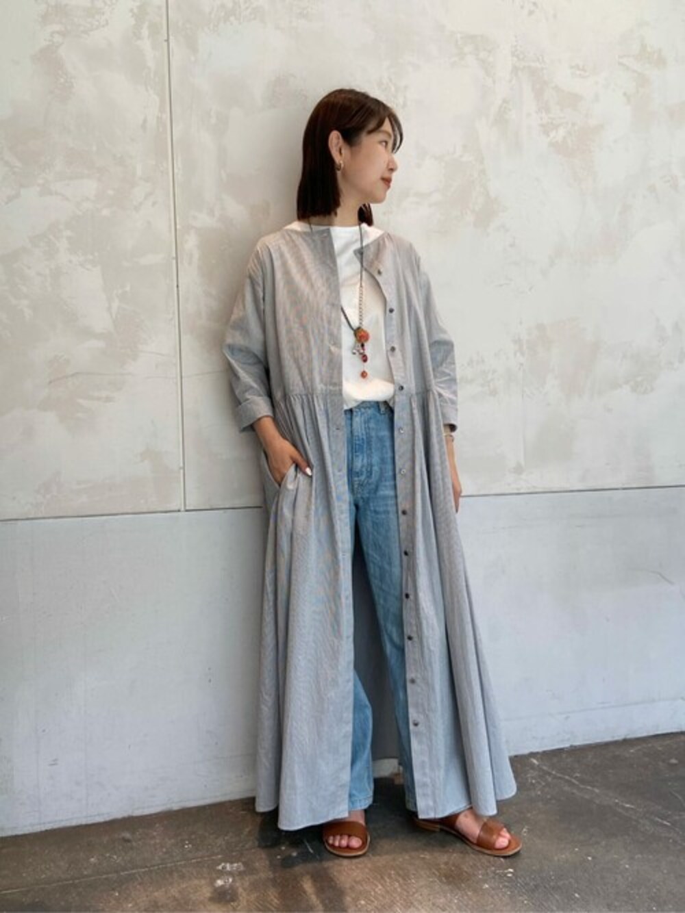 【onepiece】着用サイズ:1 一枚でも着れますが、ボタンが全部開くので羽織として。 ウエスト周りのギャザーが女性らしい印象にしてくれます。 着丈は、1サイズを着用して足首がくれるフルレングスの長さ。 短めがお好きな方は、0サイズがおすすめです。 洗濯 :手洗い可 伸縮性:なし 透け感:多少あり 裏地 :なし 光沢感:なし 色落ち:なし 【tops】着用サイズ:F シンプルな使いやすいカットソー。 羽織りもののインナーとしても合わせやすいです。 着丈は、腰周りが隠れるくらいなので合わせるボトムによってはインするとすっきり着れます。 首元も開きすぎないので首元をあまり見せたくない方にもおすすめのアイテム。 洗濯 :手洗い可 伸縮性:あり 透け感:多少あり 裏地 :なし 光沢感:なし 色落ち:なし 【bottom】 スタッフ私物 【necklace】 LA TONKINOISE 【sandal】着用サイズ:37 FABIO RUSCONI
