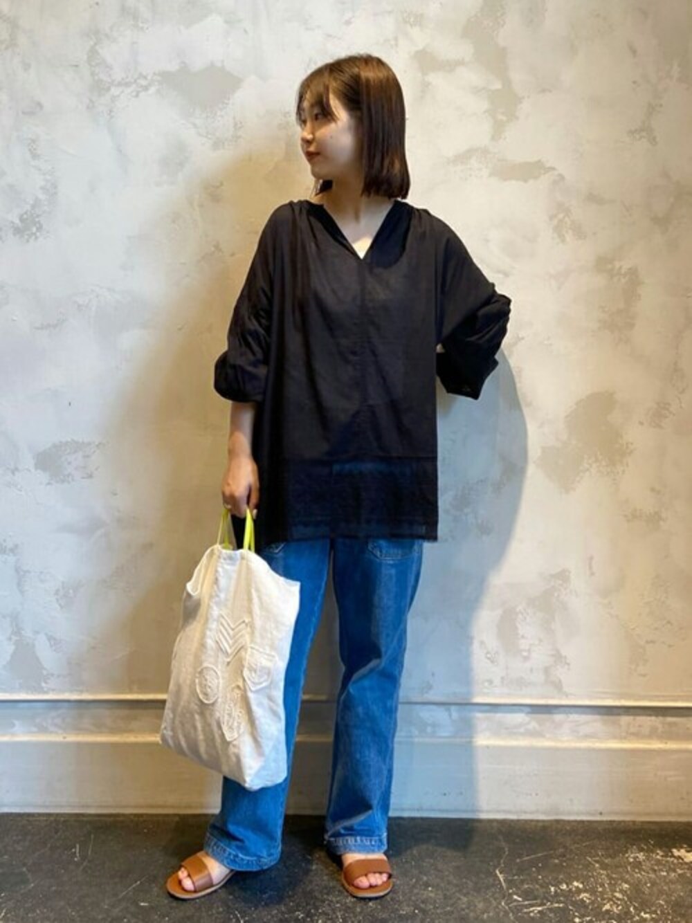 【tops】着用サイズ:F 裾にネット刺繍を施した上品なブラウス。 襟元もV開きなのですっきりとした印象で着ていただけます。 デニムと合わせてカジュアルなスタイリングがおすすめです。 着丈はお尻まで隠れるので、トラックパンツなどの細身のパンツでも合わせやすいです。 伸縮性:なし 透け感:あり 裏地 :なし 光沢感:なし 色落ち:なし 【bottom】 スタッフ私物 【bag】 BEARDSLEY 【sandal】着用サイズ:37 FABIO RUSCONI