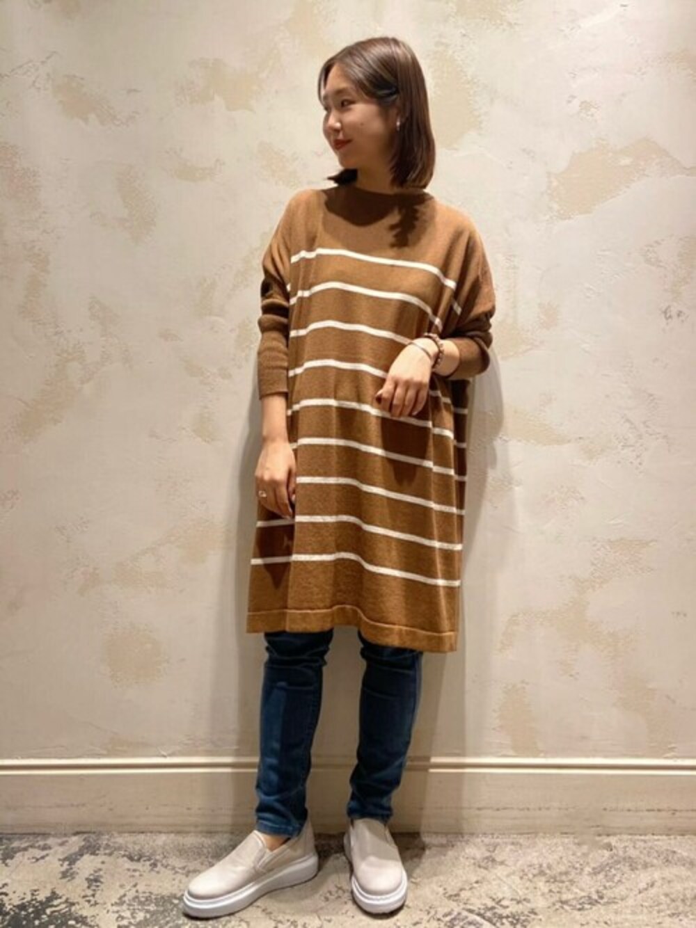 【tops】着用サイズ:F 麻に似たてたギマ素材のニット。 麻ではないのでチクチク感がなく、オチ感があります。 ドルマンスリーブでゆったり着れるデザイン。 着丈は、膝が少し見えるくらいの長さです。 伸縮性:多少あり 透け感:なし 裏地 :なし 光沢感:なし 色落ち:なし 【bottom】着用サイズ:1 定番の細身のパギンス。 ストレッチの効いた素材なので動きやすいです。 サイズは2サイズ展開で、1サイズを穿いて少し余裕があるので、ピッタリし過ぎず楽ちんです。 洗濯 :手洗い可 伸縮性:あり 透け感:なし 裏地 :なし 光沢感:なし 色落ち:なし 【bracelet】 CAMPO MAGGI 【shoes】 CORSO ROMA9