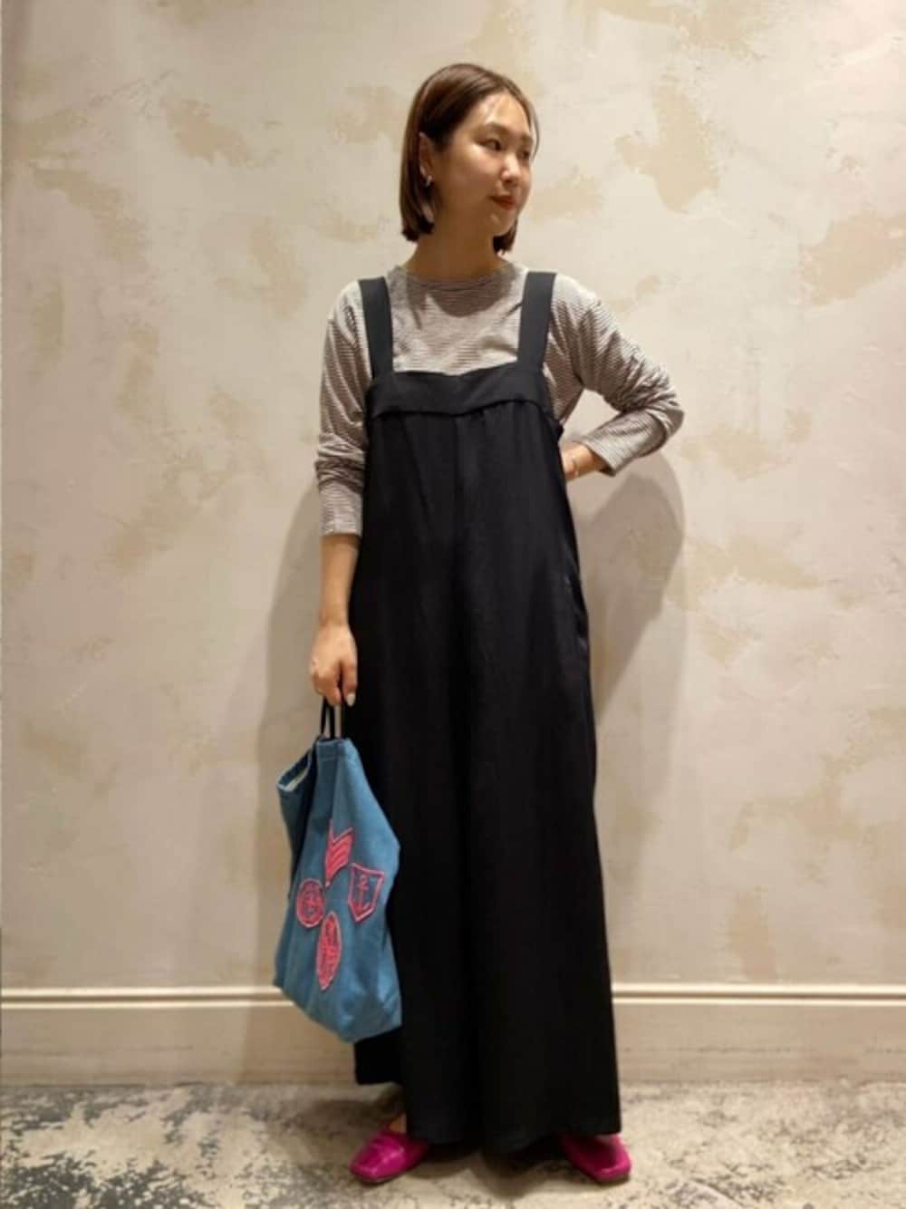 【tops】着用サイズ:F シンプルなデザインでインナーにも使いやすいすっきりとしたシルエット。 伸縮性にも優れているので着やすいです。 着丈は、お尻までしっかり隠れる長めの丈。 洗濯 :手洗い可 伸縮性:あり 透け感:多少あり 裏地 :なし 光沢感:なし 色落ち:なし 【salopette】着用サイズ:F さらっとした滑らかな素材のサロペット。 シンプルなデザインなので、ボーダーなど柄物と合わせるのがおすすめ! 着丈は足首にかかる長さ。 155cmの身長で、フラットシューズと合わせて穿けるくらいです。 伸縮性:なし 透け感:なし 裏地 :なし 光沢感:なし 色落ち:なし 【bag】 BEARDSLEY 【shoes】着用サイズ:37 FABIO RUSCONI