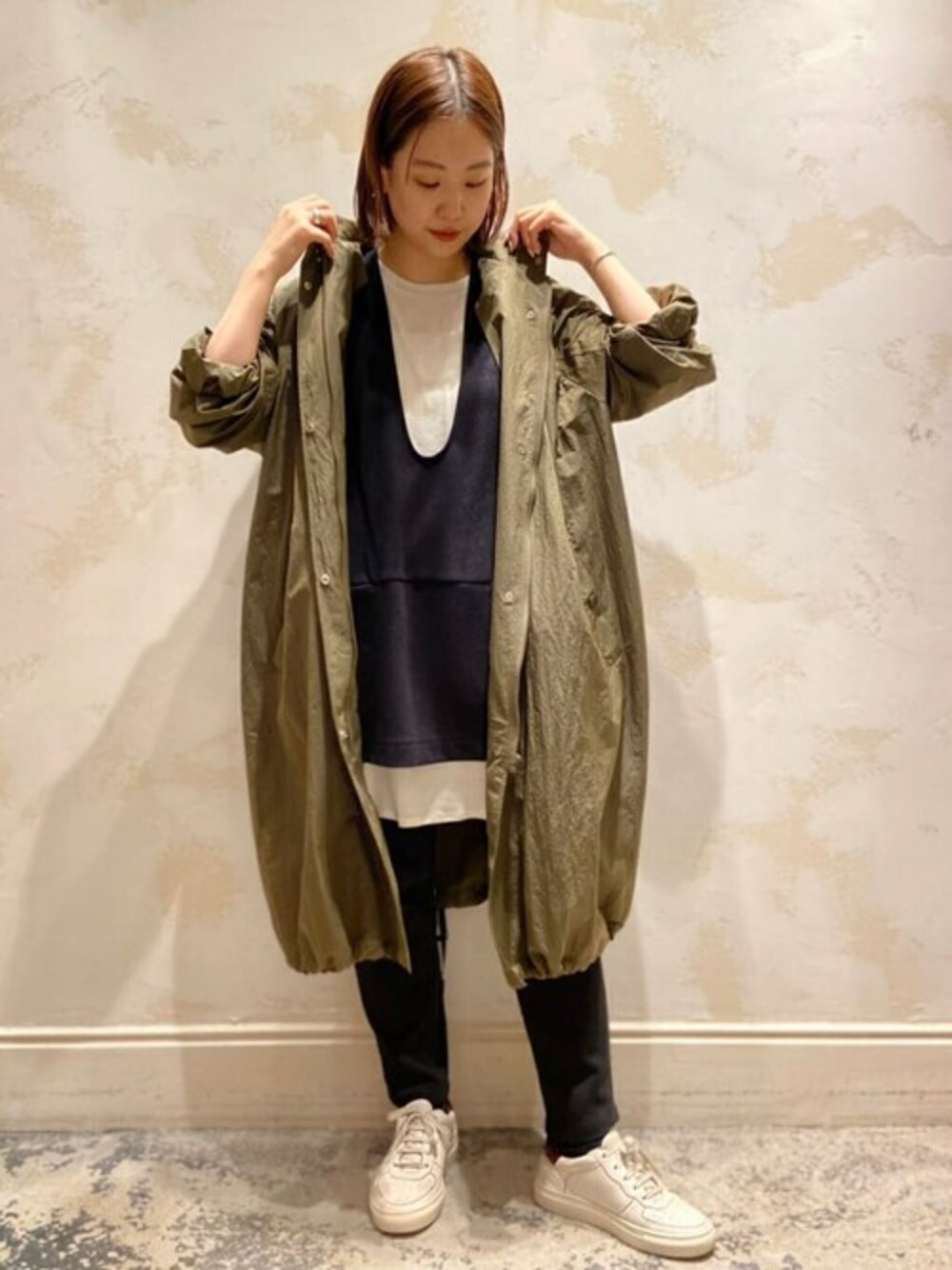 【outer】着用サイズ:F シャカシャカとしたサラッと着れるコート。 ゆったりとしたBIGサイズなので中に着るものを選ばず羽織れちゃいます。 裏地もないのでとても軽い着心地◎ そして、裾はリボンで絞れるので調節可能なので、着丈も多少の変えていただけます。 フードもあるのでカジュアルなアイテムとよく合います。 洗濯 :手洗い可 伸縮性:なし 透け感:なし 裏地 :なし 光沢感:なし 色落ち:なし 【tops】着用サイズ:F 凹凸感のあるブークレの素材を使ったプルオーバー。 プルオーバーといってもベストのように被りでサッと着れます。 着丈は、お尻までしっかり隠れる長さです。 胸元がざっくり開いており、インナー次第で雰囲気を楽しめます。 洗濯 :手洗い可 伸縮性:あり 透け感:なし 裏地 :なし 光沢感:なし 色落ち:なし 【inner】着用サイズ:F 肌触りのいいガーゼのような素材を使ったカットソー。 インナーにも使えて、一枚でももちろん着ていただける万能アイテムです。 着丈は、お尻までしっかり隠れる長めの着丈で、サイドにはスリットも入ったいるのですっきりとした印象に。 洗濯 :手洗い可 伸縮性:あり 透け感:あり 裏地 :なし 光沢感:なし 色落ち:なし 【bottom】着用サイズ:1 柔らかなダンボール素材を使ったパンツ。 ストレッチが効いているので、座ったり立ったりなど動きやすいです。 着丈は1サイズを穿いて足首にかかる長さ。 着た感じも足の形をぴったり拾わず少しゆとりを持って穿くことができます。 洗濯 :手洗い可 伸縮性:あり 透け感:なし 裏地 :なし 光沢感:なし 色落ち:なし
