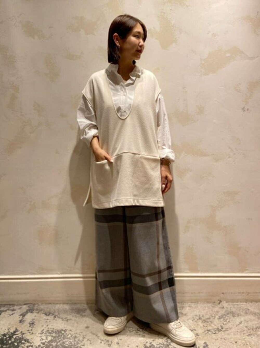 【tops】着用サイズ:F 凹凸感のあるブークレの素材を使ったプルオーバー。 プルオーバーといってもベストのように被りでサッと着れます。 シャツと重ねるときちんと感も出て、クラシカルな印象に。 着丈は、お尻までしっかり隠れる長さです。 胸元がざっくり開いており、インナー次第で雰囲気を楽しめます。 洗濯 :手洗い可 伸縮性:あり 透け感:なし 裏地 :なし 光沢感:なし 色落ち:なし 【shirt】着用サイズ:F 後ろの裾に香水瓶の刺繍が施されたブラウス。 刺繍糸がシャツと同なじ色なのでさりげなさがおしゃれなアイテム。 洗濯 :手洗い可 伸縮性:なし 透け感:多少あり 裏地 :あり 光沢感:なし 色落ち:なし 【bottom】着用サイズ:1 定番のウエストリブシリーズのワイドパンツ。 秋冬らしいチェック柄のデザイン。 大判のチェック柄なので派手すぎず使いやすい一枚。 サイズは3サイズ展開で、真ん中のサイズの1サイズを穿いています。 伸縮性:ウエスト部分のみあり 透け感:なし 裏地 :あり 光沢感:なし 色落ち:なし 【shoes】 スタッフ私物