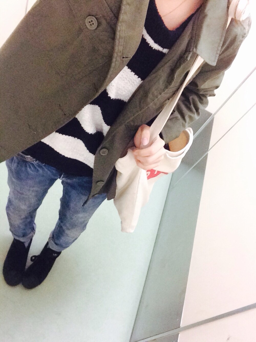 ミリタリーシャツ:ノーブランド サマーニット:イーハイフン デニム:Levi's 靴:adidas エコバック:ノーブランド 寒いので、フルレングスとニットで防寒しました(~_~;)
