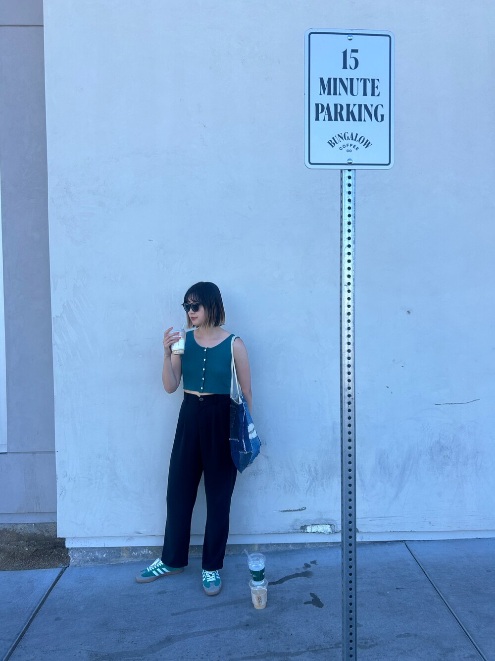 📍ショート丈のタンクトップ 📍ハイウェストパンツ 📍スニーカー