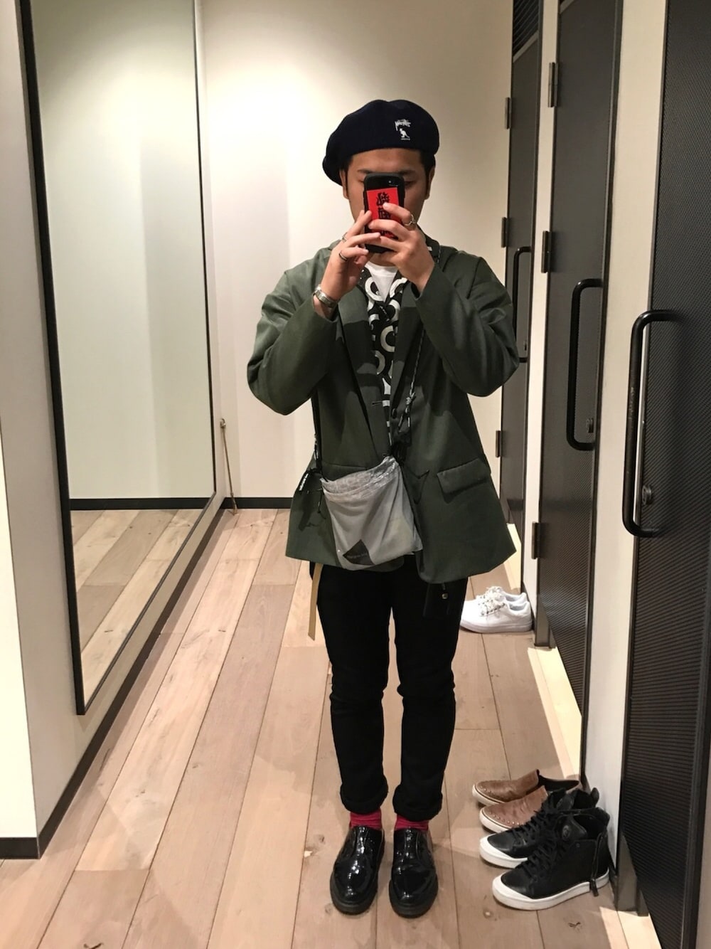 初WEAR投稿! 自撮りするのに抵抗があり中々出来なかったけどこれから慣れていきまーす!✨ 最近お気に入りのdulcamaraのよそ行きジャケットにstussyの総柄シャツ!シンプルなジャケットに総柄シャツの組み合わせいい感じ!✨😎 パンツはbig jhonのスキニーにDr.Martens×BEAMSの3ホールで差しにショッキングピンクの靴下投入! ただ今日はこの格好では少し暑く失敗でした😅 これからちょくちょく投稿しようと思うのでよろしくお願いします🙇✨