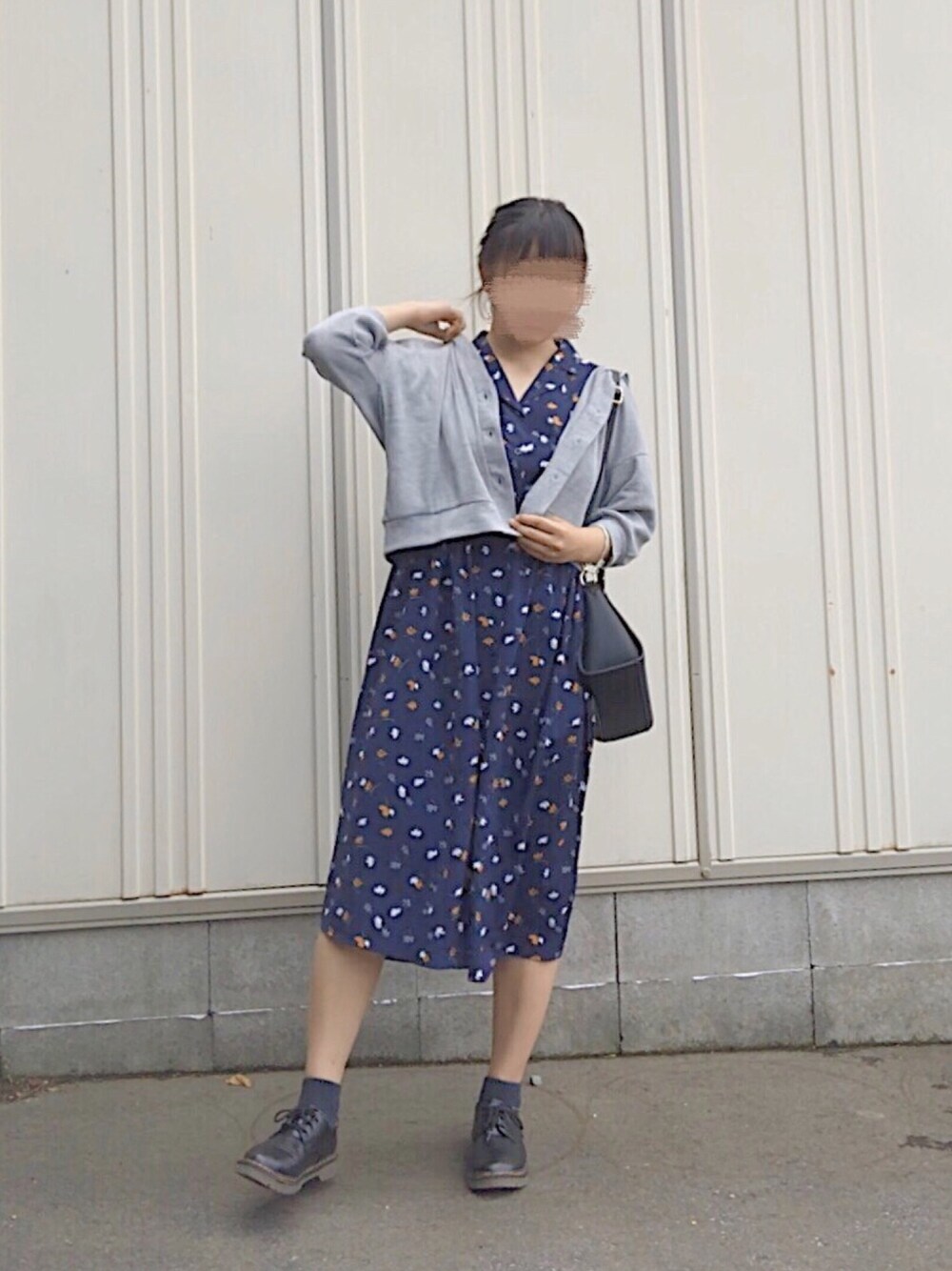 閲覧ありがとうございます😊 花柄ワンピースとグレーカーディガンでガーリーに。 カーディガンはショート丈にする事でウエスト位置をアップしてくれます! シューズ、バックは黒にまとめました。