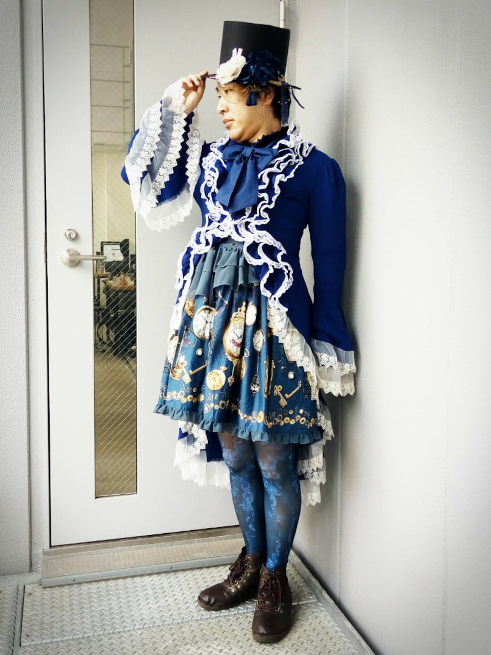 Metamorphose の Timelag ドレス(青) に Triple*fortune メンズロングブラウス(青)、 H.NAOTO 青薔薇タイツの組み合わせで青コーデとなりました。ロングブラウスとSKのレイヤードと濃い青の押し出しがポイントでしょうか。 #ootd