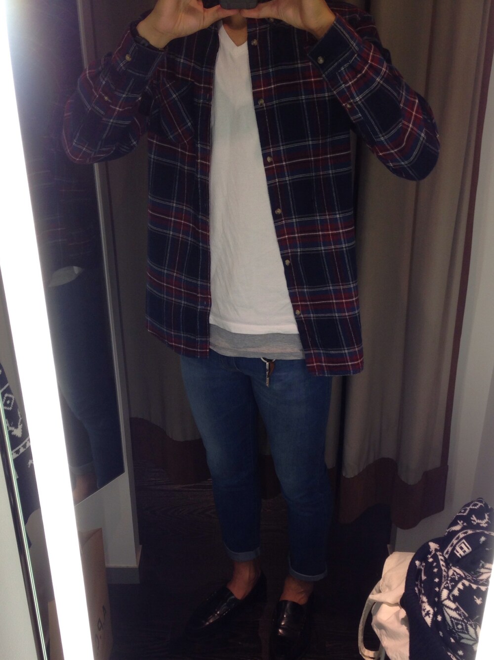 ファストファッションです。試着室で撮ったので暗いです。 今日は名古屋に念願のA.P.C.のデニムを取りに行ってきました。1から育てて、色落ちを楽しむべく、大事に履いていきたいと思います。 シャツ:H&M インナー:UNITED ARROWS パンツ:UNIQLO シューズ:REGAL