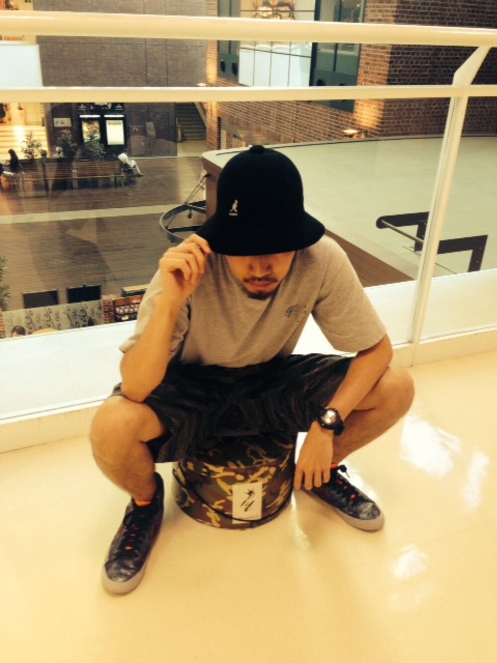 今最も旬なKANGOLから、大人気BERMUDA CASUALのBLACKのMサイズをセレクト。 タイトからオーバーサイズなファッションまで万能なこのベル型ハット。 またまた、あえてシンプルなグレーTシャツとタイガーカモショーツで合わせてみました。