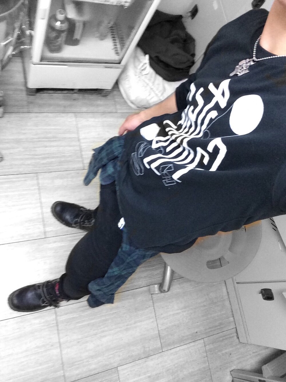 室内での勤務中の格好です🙌🏻 これを外でやる季節ではないのでお気をつけください笑 チェックシャツの腰巻があるだけで大分おしゃれに見えると思います! 自分は少し斜めに巻くとオシャレかなと思います!✨