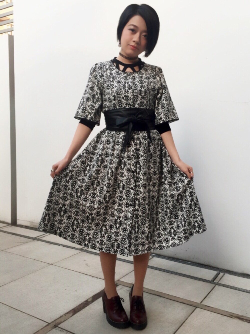 春のモノトーン🌸フォークロア柄ワンピにサッシュベルトを合わせてトレンドを取り入れてみました!ブーツのチェリーレッドが差し色です