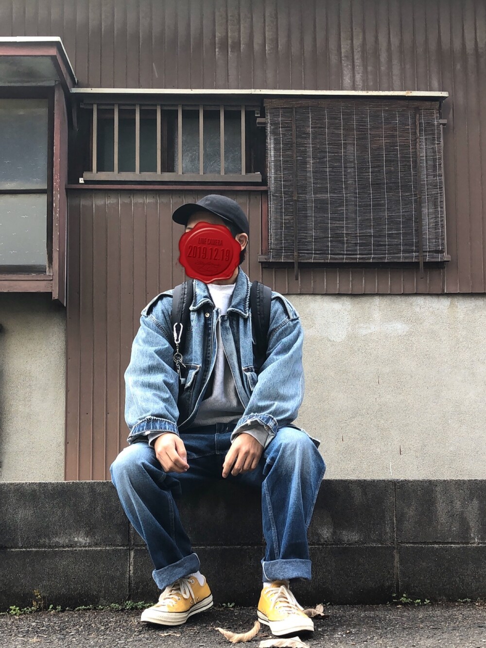 デニムデニム アウターは父親が若い頃に着ていた物なので古い 帽子はユニクロ デニムにマスタード合うね