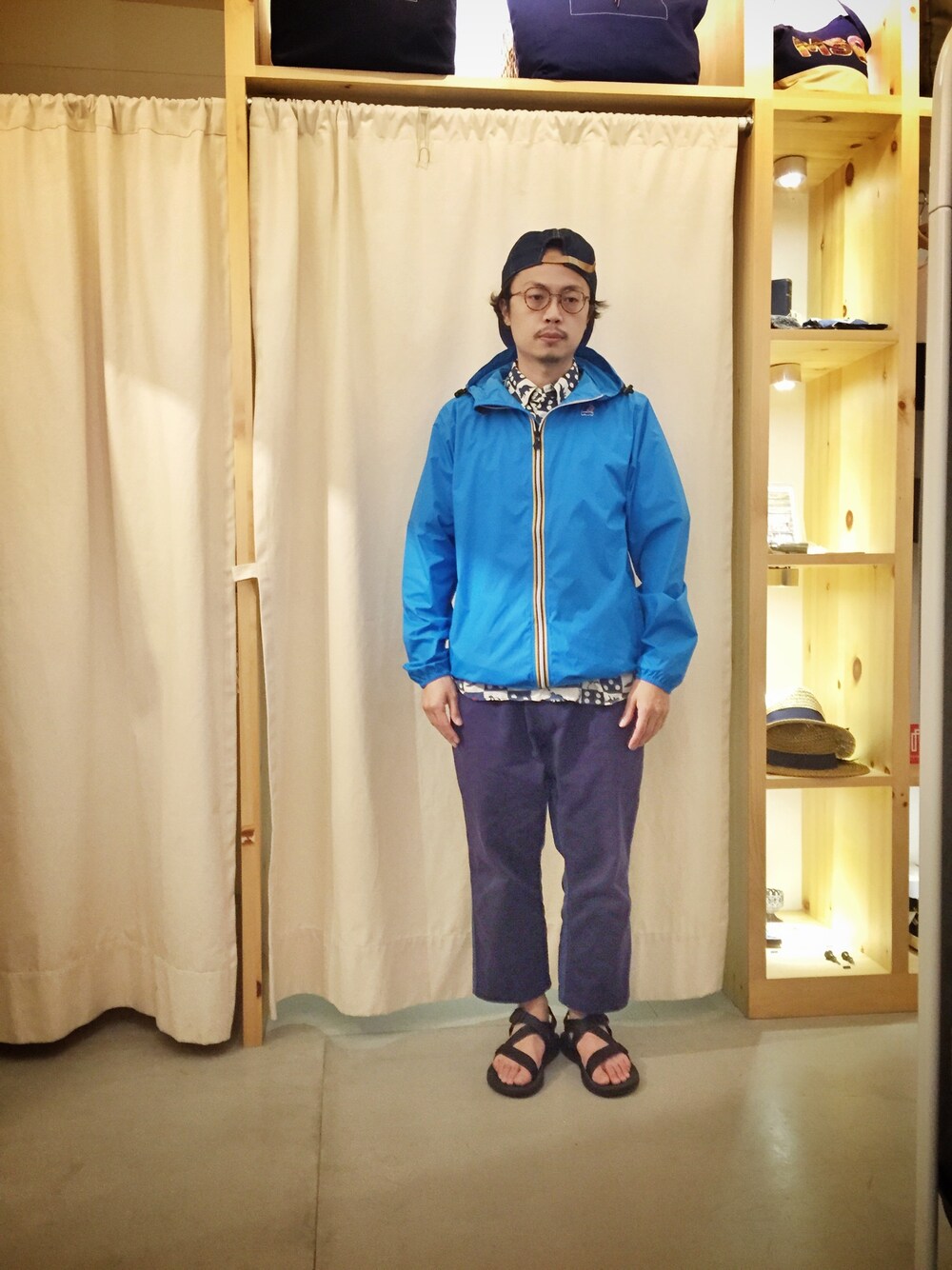 最近台風の影響で午後はいきなり雨が強く降っている、傘を持つのが嫌な僕はk-wayの重要性は鮮明となった。シンプルのアウトドアスタイルの中に差し色の柄シャツは効いている。 4年前販売しているクライミング9分丈パンツはオーバーサイズで、今でも愛用中(^^)