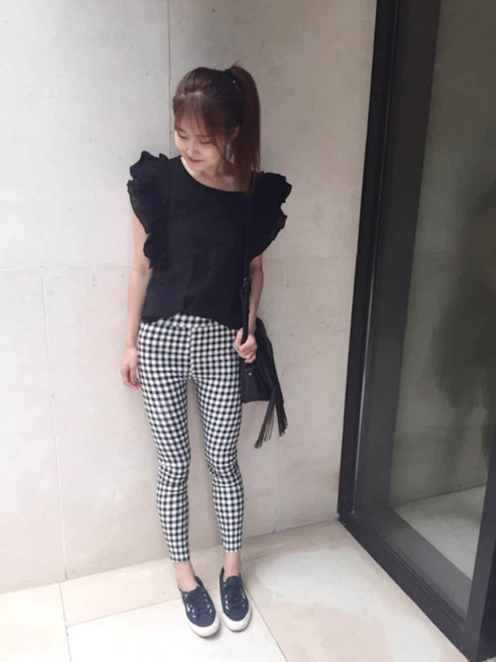 カジュアルなギンガムチェックのスキニーに合わせたガーリーなコーデです♪ たっぷりなフリルボリュームのブラウスは存在感たっぷりでとってもキュートだよ★ スニーカーに合わせてカジュアルミックスに!