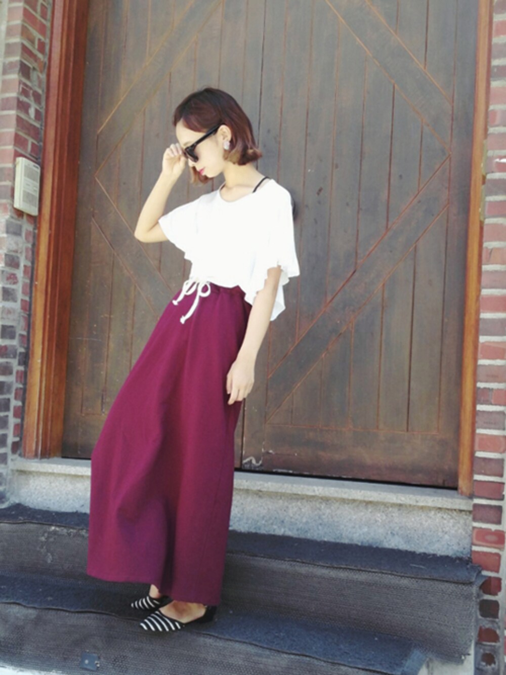 袖フリルの可愛いTシャツにはスリムラインのスウェットマキシスカートをあわせて楽チンコーデにしたよ!! ワインレッドのクラシカルなカラーが大人っぽにみせてくれる☆ 足下はボーダーパンプスでちょっぴり上品に☆
