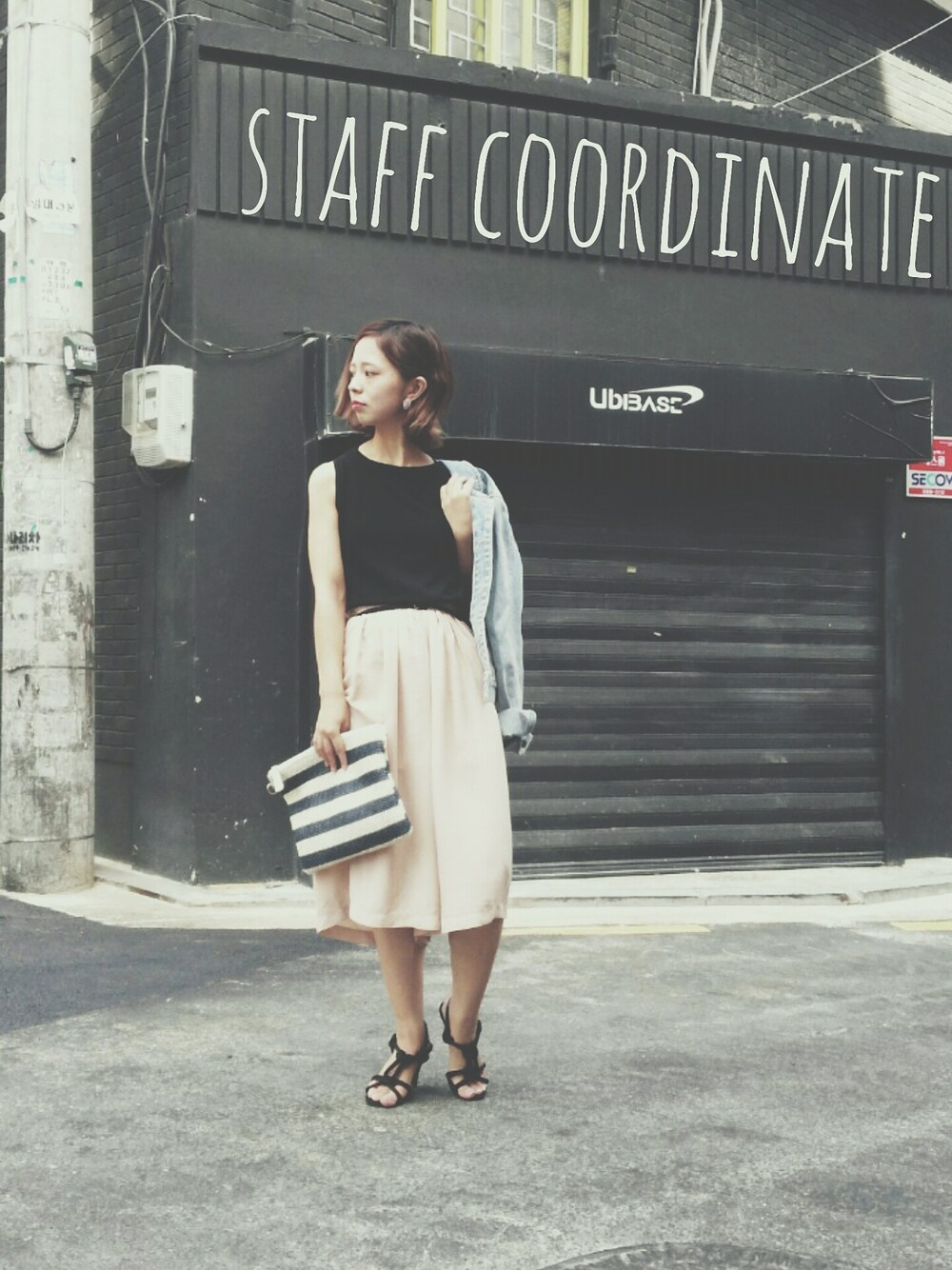 上品な甘さがあるシフォンガウチョパンツはデニムジャケットとあわせてちょっぴり辛めなスタイルに☆ 全体的にシンプルだからボーダークラッチを持って夏らしいマリンな要素もインしたよ!! ヌーディーなサンダルで足下は色っぽく♪