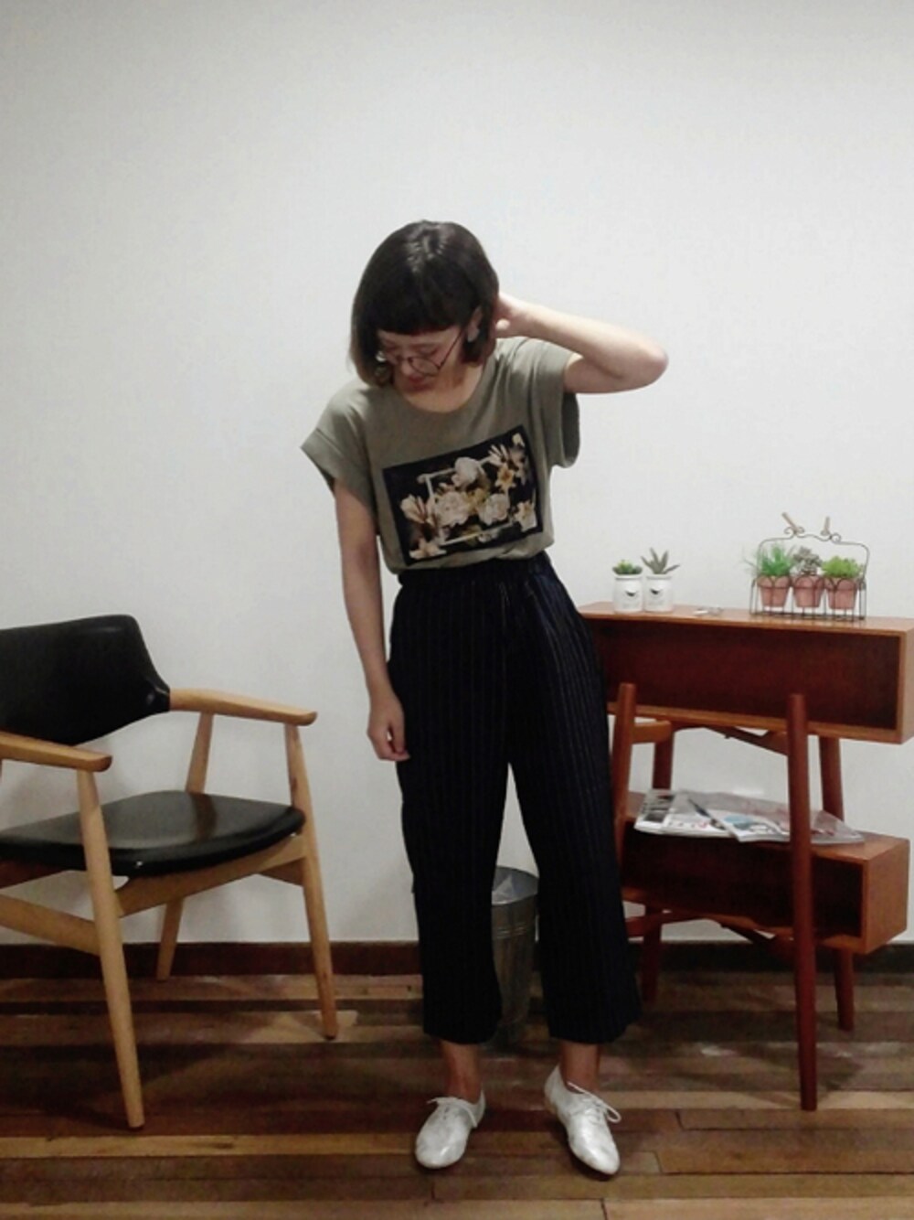 クラシカルなグラフィックTシャツにはメンズライクなストライプパンツをあわせて落ち着いたカジュアルスタイルに☆ 全体的に渋色だから足下は白のレースアップシューズで上品に抜け感をインしたよ!!