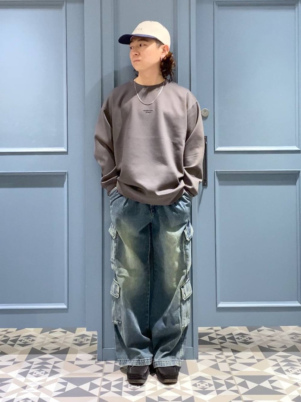 はいね(RAGEBLUE立川ルミネ店)のデニムパンツ「Over dye denim 8pockets wide cargo pants/オーバーダイデニム/8ポケット/ワイドカーゴパンツ」を使ったコーディネート