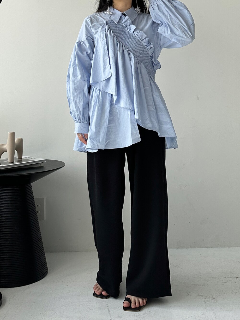 . ブルーシャツコーデ👔 パンツは148センチでも着れた (ヒールあり) アホ毛すごい😂