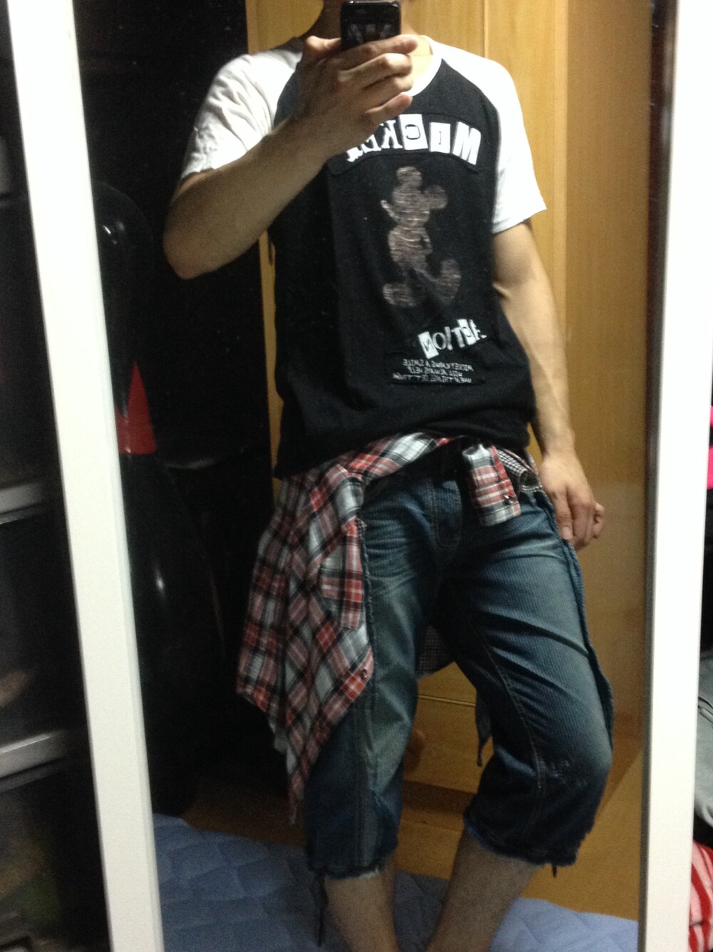 閲覧ありがとうございます♪( ´▽`) フォロー&セーブよろしくお願いします(=´∀`)人(´∀`=) 今日はミッキーTシャツ! 白黒の感じがめっちゃ惚れ込んで買った(≧∇≦) パンツは派手にしようかと思ったけどデニムパンツでw そしたら めっちゃ地味になったからチェックシャツ巻いてみた