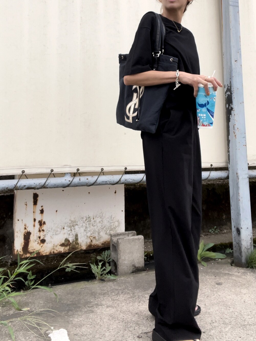 ブラック系のスラックスを着用したレディースの夏コーディネートの3枚目の写真