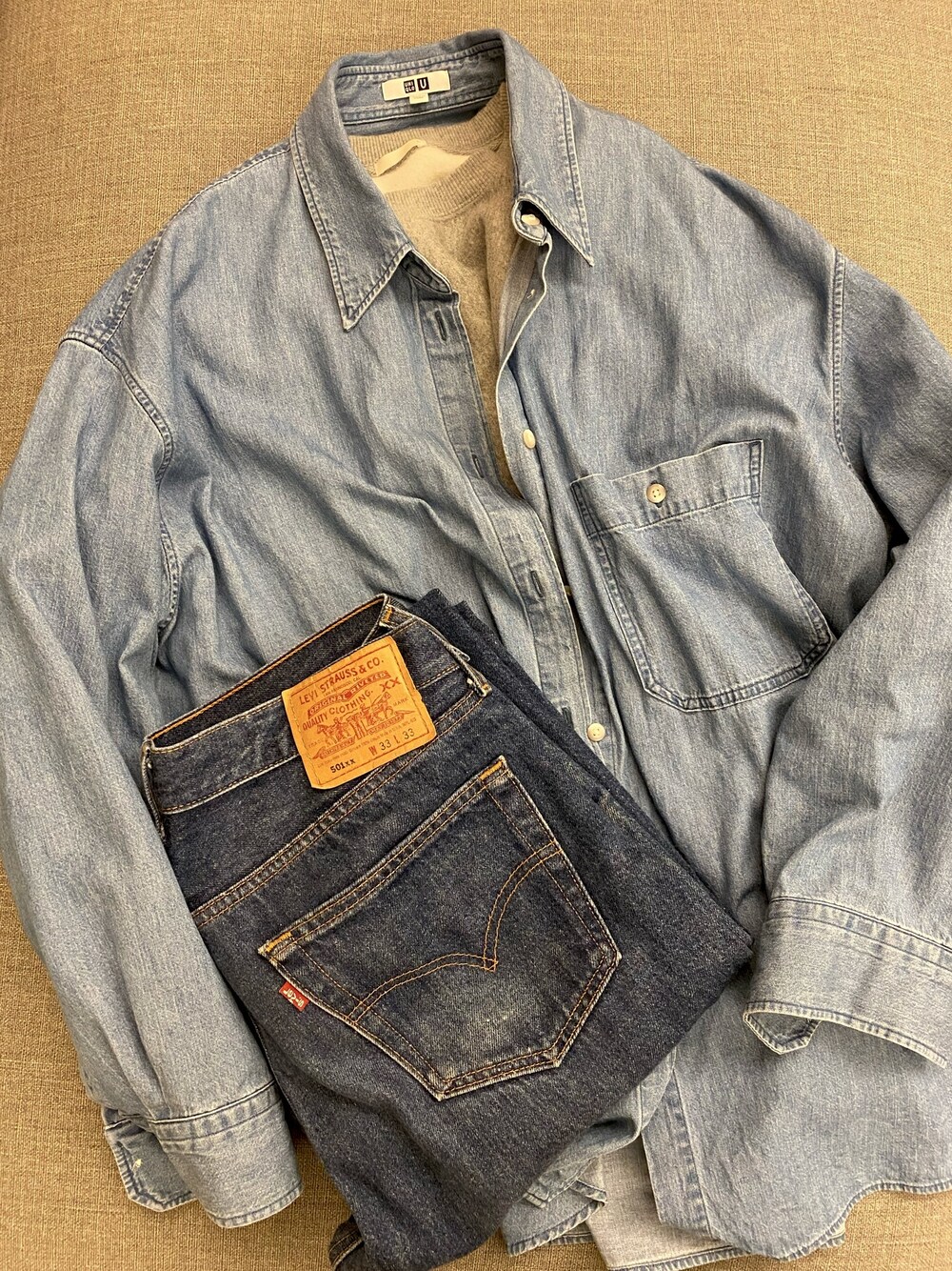 ブルー系のシャツ/ブラウス、ブルー系のデニムパンツ、グレー系のスウェットを着用したメンズの春コーディネートの1枚目の写真