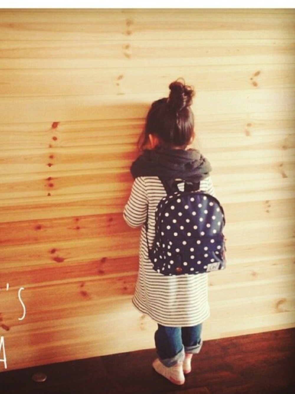 ブルー系のバックパック/リュックを着用したキッズの春コーディネートの1枚目の写真
