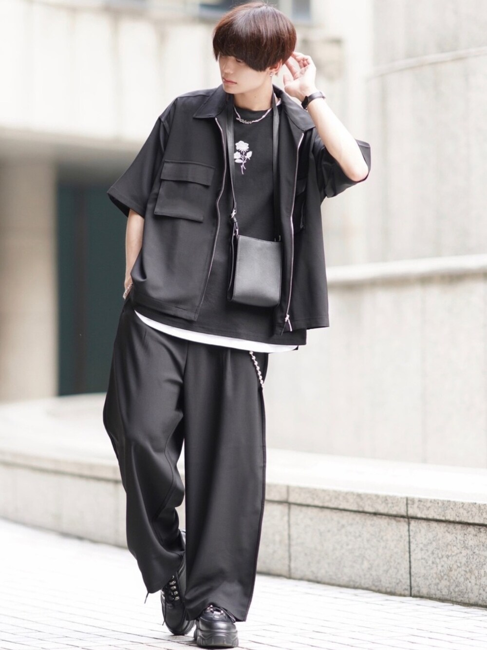 犬飼京 inukai keiのシャツ/ブラウス「セットアップ ポリトロストレッチ半袖ビックポケットジップシャツ&ワイドパンツ」を使ったコーディネート