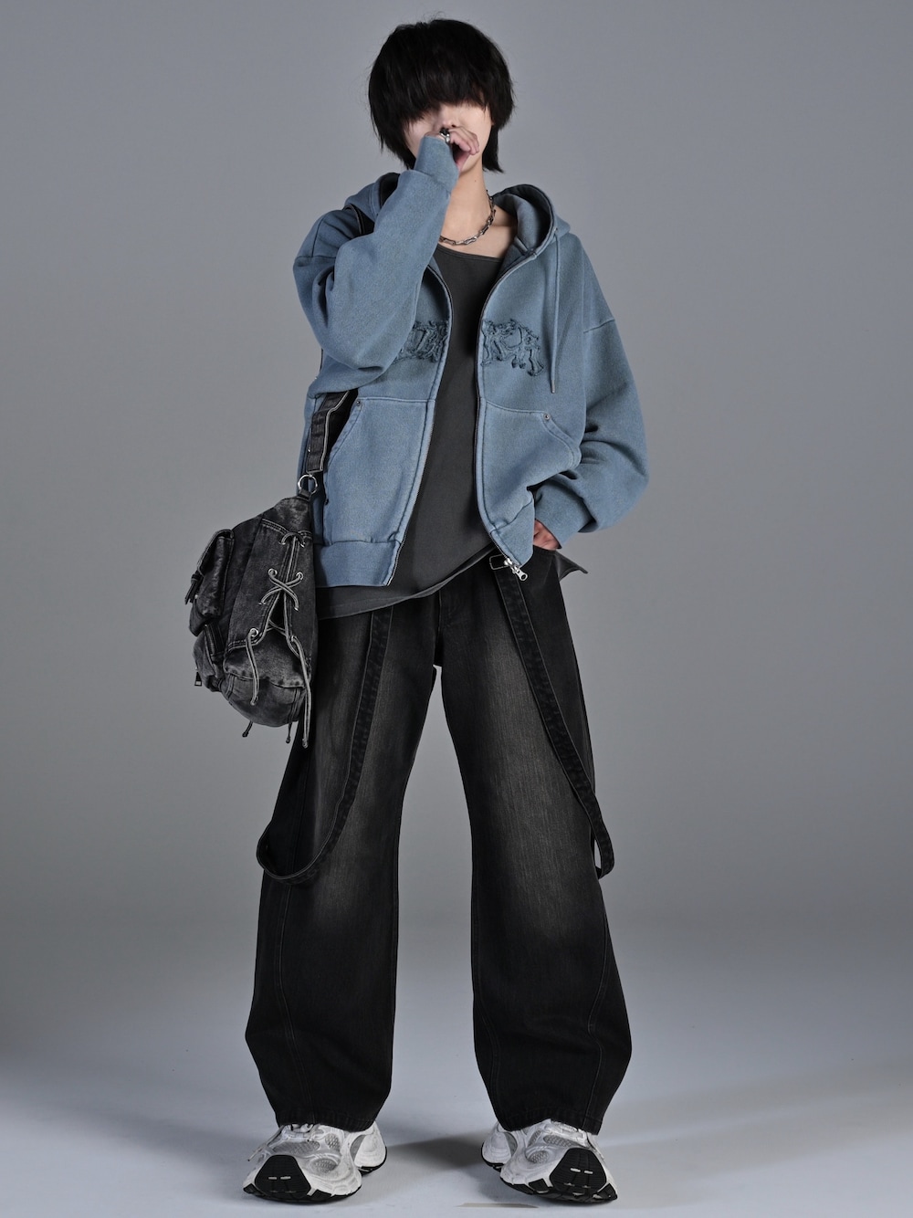 犬飼京 inukai keiのデニムパンツ「vintage make curved leg 3D suspender denim / ヴィンテージメイクカーブレッグ3Dサスペンダー(取外し可)デニム」を使ったコーディネート