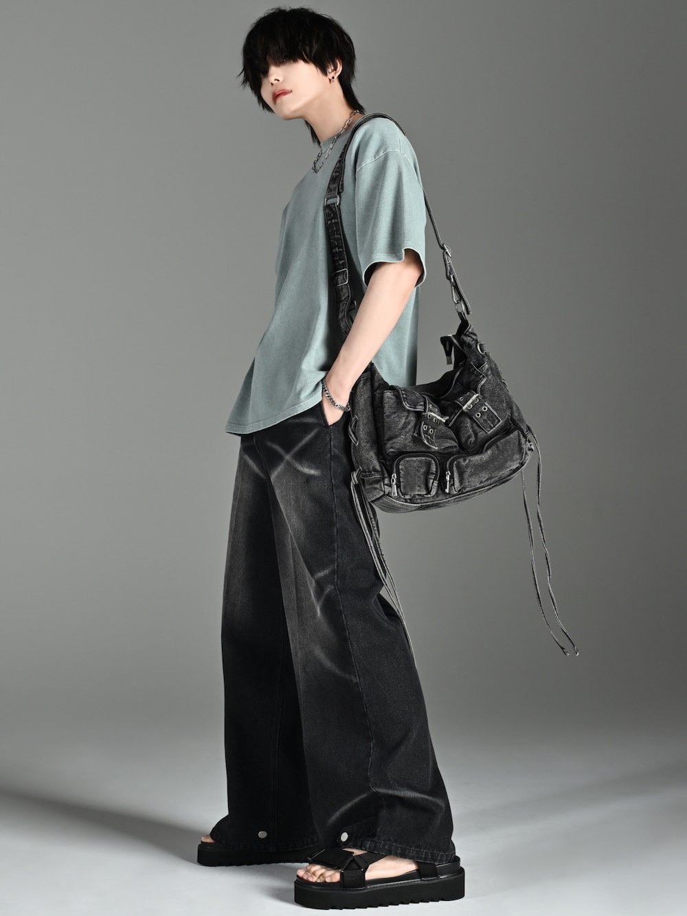 犬飼京 inukai keiのショルダーバッグ「vintage denim shoulder bag / ヴィンテージデニムショルダーバッグ」を使ったコーディネート