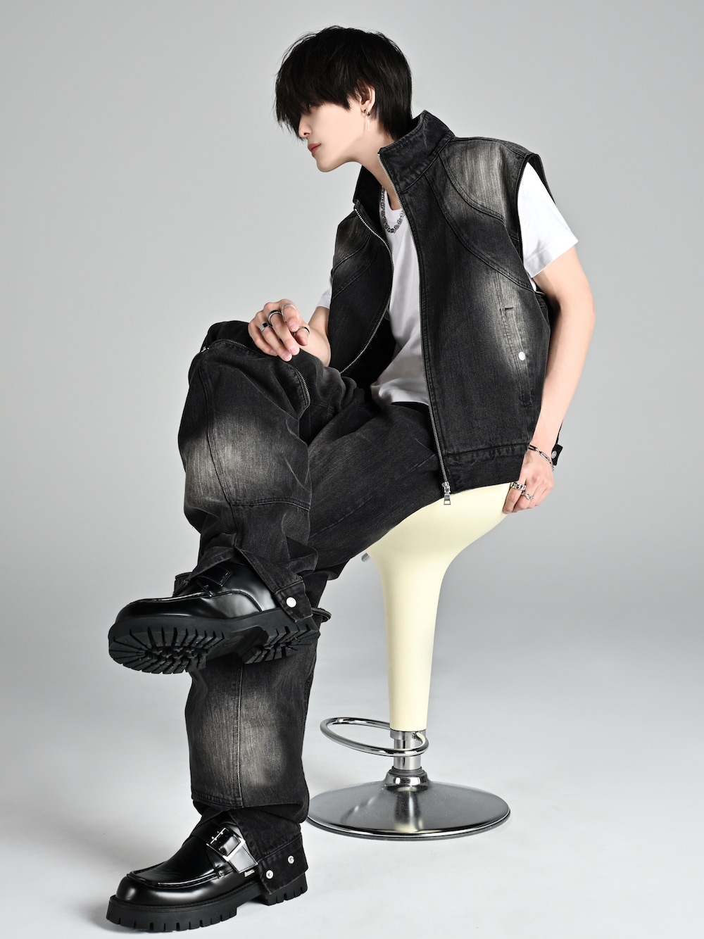 犬飼京 inukai keiのデニムジャケット「3way zip sleeve blast denim blouson / 3ウェイジップスリーブブラストデニムブルゾン」を使ったコーディネート