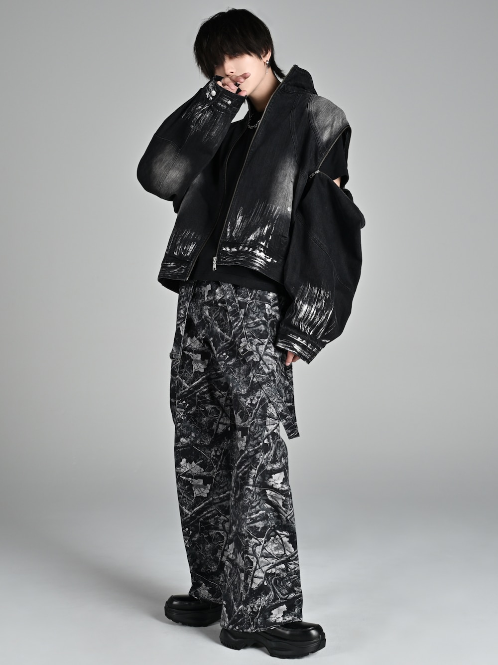 犬飼京 inukai keiのデニムジャケット「3way zip sleeve blast denim blouson / 3ウェイジップスリーブブラストデニムブルゾン」を使ったコーディネート