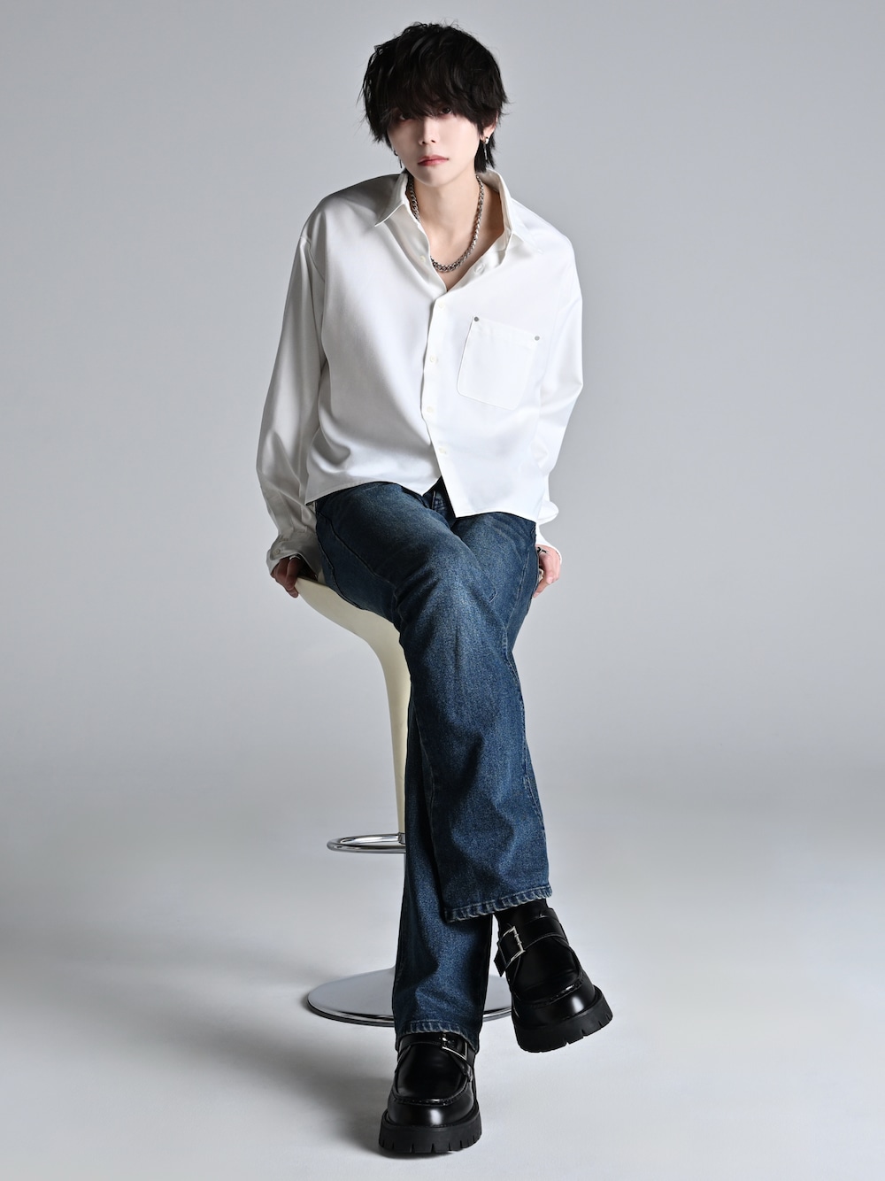 犬飼京 inukai keiのシャツ/ブラウス「Cropped Regular Collar Silhouette Shirt / クロップド・レギュラーカラー・シルエット・シャツ」を使ったコーディネート