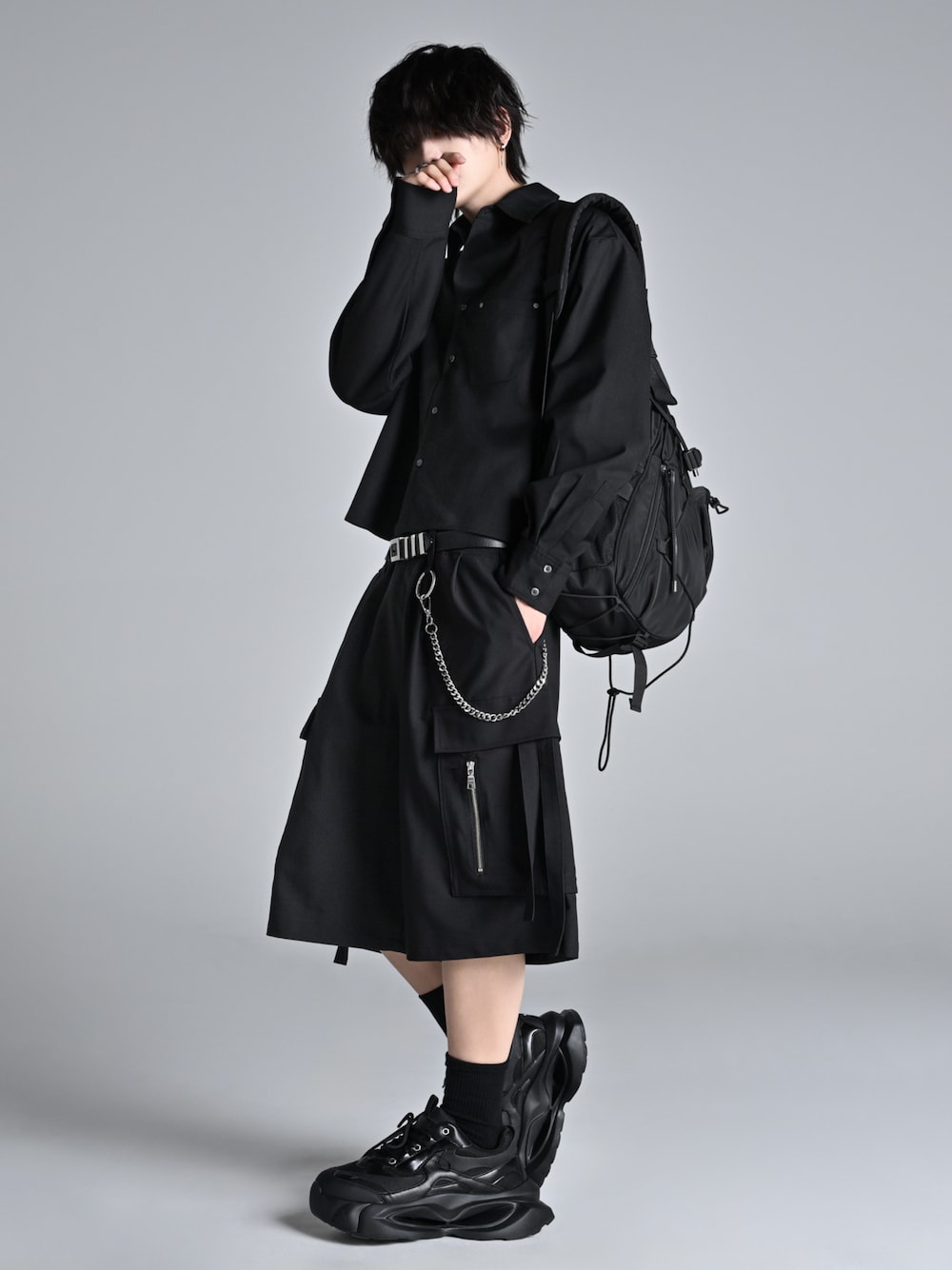 犬飼京 inukai keiのシャツ/ブラウス「Cropped Regular Collar Silhouette Shirt / クロップド・レギュラーカラー・シルエット・シャツ」を使ったコーディネート