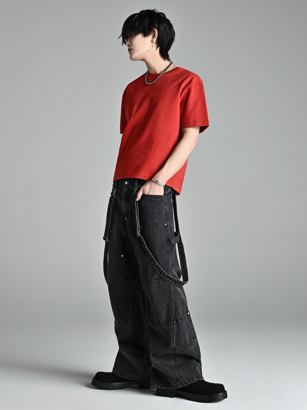 犬飼京 inukai keiのデニムパンツ「vintage make curved leg 3D suspender denim / ヴィンテージメイクカーブレッグ3Dサスペンダー(取外し可)デニム」を使ったコーディネート