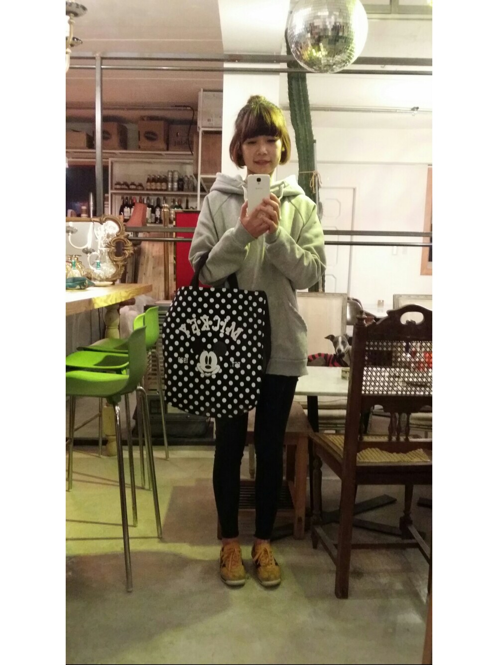 イエロー系のスニーカーを着用したレディースの秋コーディネートの1枚目の写真