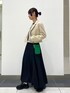 ご覧頂きありがとうございます。 ショートジャケットを普段使いしやすいようカジュアルに合わせたスタイリングです。 ジャケットは丈が短くボリュームのあるボトムスと合わせていただいてもバランスよくご使用いただけます。 ワンピースなどとも相性がよく、ON/OFFどちらでも使えるので着回し力抜群のアイテムです! 伸縮性のある生地感で着心地も軽くて満点でした◎ 同素材のスカートと合わせてセットアップとしても着用いただけます。 今回はバルーンスカートと合わせてみました♪ スカートは下にボリュームがたまるシルエットで、腰周りにはボリュームがこないので着膨れした印象にならずにご使用いただけます! 短丈トップスと合わせるのがオススメです。 ふわっと広がる女性らしいシルエットが大人気のアイテムです! スカート 160cm/M size