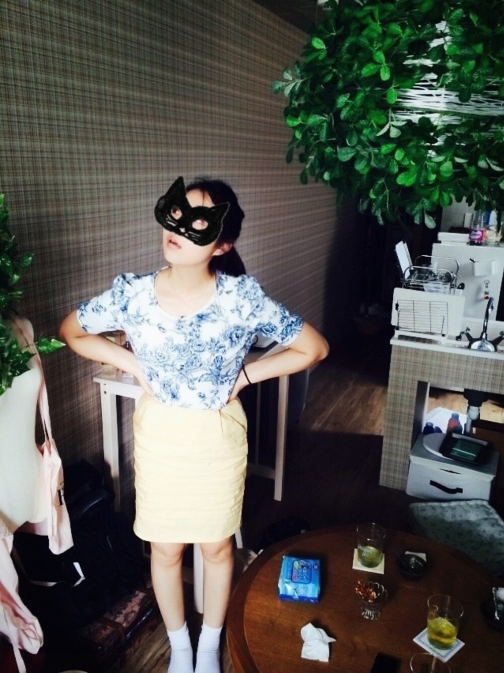 トップスは2年前にForever21で購入したもので肩のふんわりしたレトロなデザインがお気に入りです。髪はオールバックポニー。ナチュラルにシュシュでユル結びしました。 マイルーム初公開…★