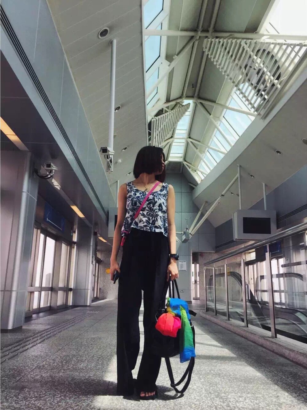 ブルー系のタンクトップ、ブラック系のチノパンツを着用したレディースの冬コーディネートの1枚目の写真