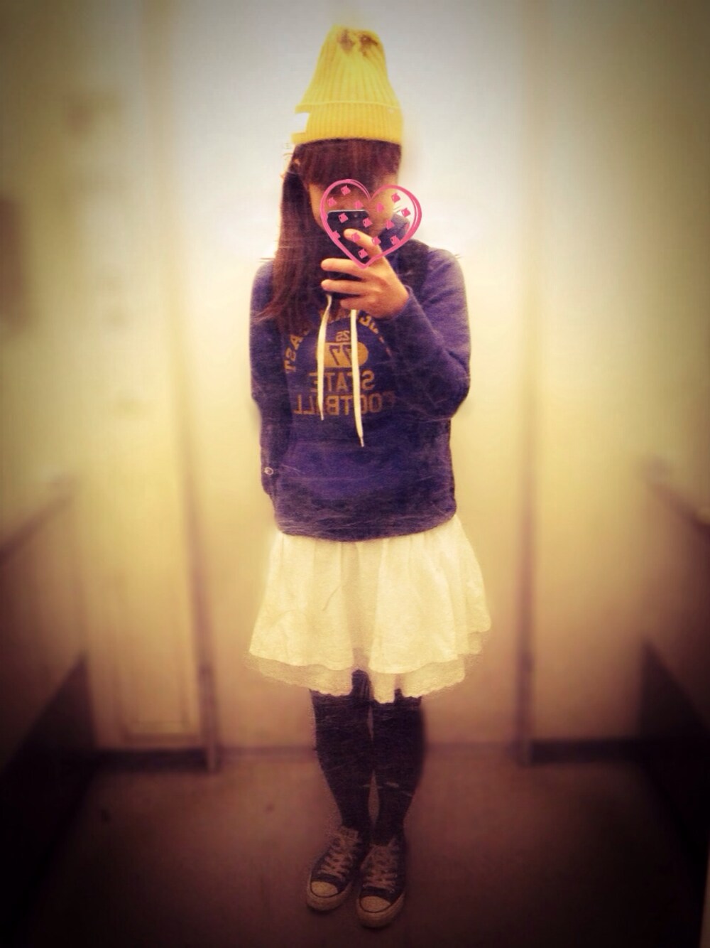 チャンピオンのパーカー 古着のスカート 黒タイツの季節がやってきた!