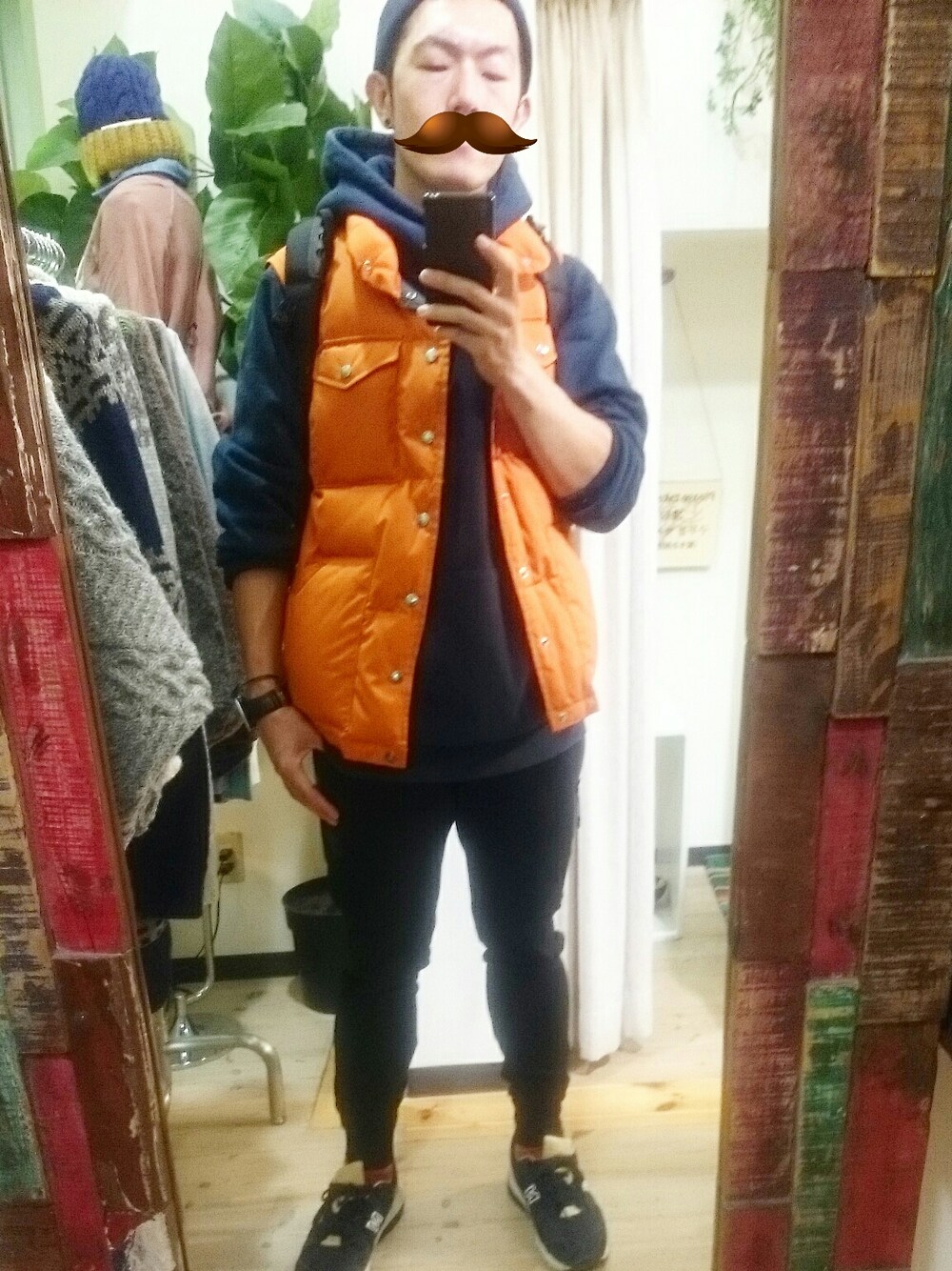 たまには明るい色で。 いまの時期はパーカーにダウンベストくらいがちょうどいいかも