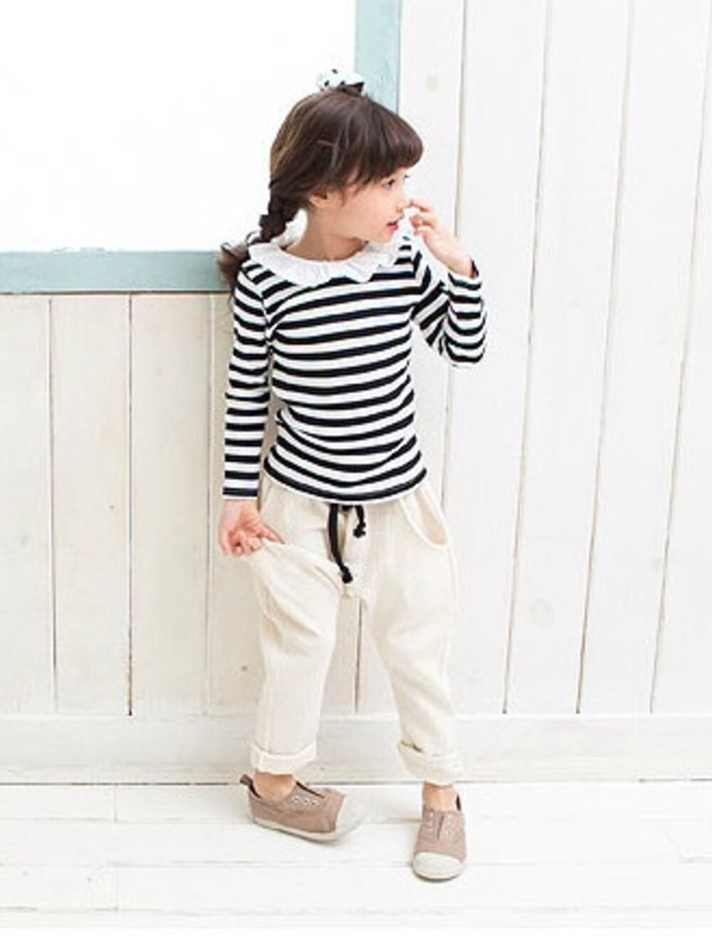 スプリングマリンコーデ( •ॢ◡-ॢ)-♡ ピエロなフリルえり ボーダーカットソー と アイボリーの リラックスパンツ 春が待ち遠しいですねぇ(๑˃̵ᴗ˂̵)و