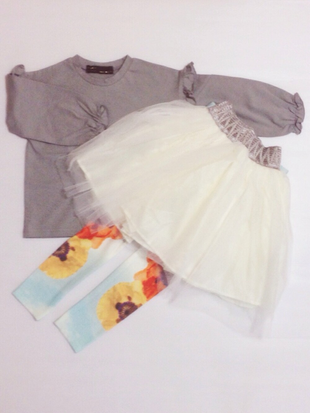 おんなのこコーデ💘 フリルカットソー と チュールスカート と お花レギンス パンチのあるお花レギンスが主役の コーデです🌺🌻🌺 早く身軽になりたい! 春よこい〜🍀🍀🍀