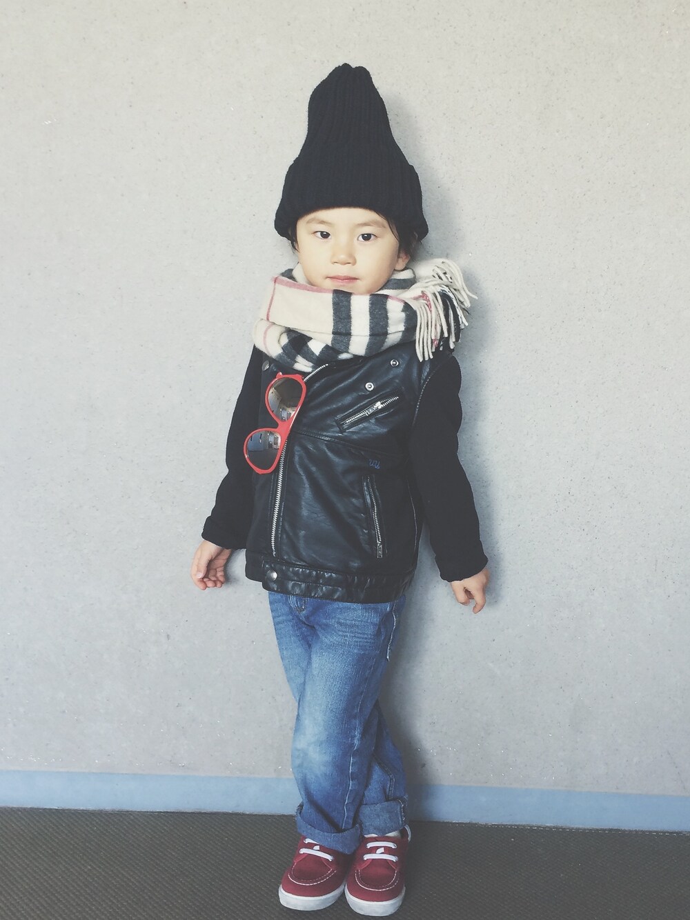 ((⌯˃̶᷄₎₃₍˂̶᷄ ॣ)プッ♪ 次男のこのポーズ、何だかふいちゃいます。 大きい帽子とマフラーは、母のもの。 数あるアウターの中から、選んでしまう このアウター♡ 母のかなりのお気に入りです。